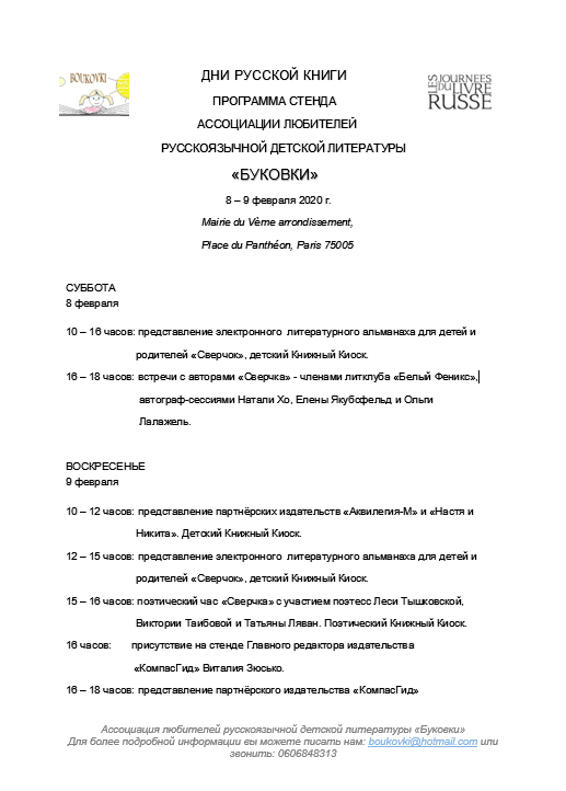 8 и 9 февраля 2020 года наша ассоциация представит свою деятельность и электронный альманах "Сверчок" в рамках 11х европейских дней русской книги и русскоязычной литературы, которые пройдут в Мэрии 5 округа Парижа.