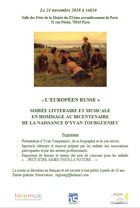 Одним из таких событий стал русско-французский литературно-музыкальный вечер, состоявшийся 24 ноября, в Мэрии 15 округа Парижа. В ходе вечера чествовали не только И.С. Тургенева, но и маленьких художников, принявших участие в общефранцузском детском художественном конкурсе посвящённом 200-летию писателя «...вы всё-таки любите природу...».