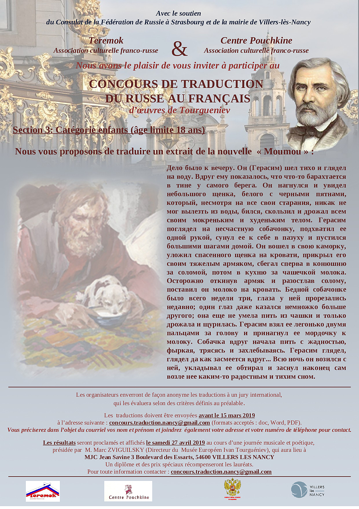 Ассоциация "Теремок" из города Нанси сообщила нам о новом конкурсе перевода. Героем конкурса стал И.С. Тургенев. Именно его произведения предложены к переводу как детям, так и взрослым. Прилагаем афишку Конкурса. Удачи!